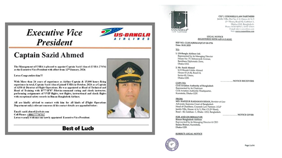নিজস্ব প্রতিবেদক: আদালত অবমাননা এবং নিয়ম বহির্ভূত কাজের জন্য ইউএস-বাংলা এয়ারলাইন্স এবং ক্যাপ্টেন সাজিদ আহমেদ এর বিরুদ্ধে লিগ্যাল নোটিশ দিয়েছে বিমান বাংলাদেশ এয়ারলাইন্স।