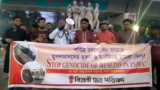 রোববার ঢাকা বিশ্ববিদ্যালয়ের রাজু ভাস্কর্যে আয়োজিত এক বিক্ষোভ সমাবেশ থেকে এ দাবি জানানো হয়। এ সময় ‘হিন্দু মুসলিম এক হও, নিপীড়ন রুখে দাও’, ‘হিন্দুত্ববাদের কালো হাত, ভেঙে দাও গুড়িয়ে দাও’, ‘মানবতা দিচ্ছে ডাক, ভারতীয় মুসলমানরা মুক্তি পাক’, ‘মুসলিম লাইভ ম্যাটারস, স্টপ দ্য জেনসাইড’, ‘স্টপ দ্য হেইট, জাস্টিস ফর ইন্ডিয়ান মুসলিমস’, ‘রামাদান ম্যাসাকার, মাস্ট ইন্ড মাস্ট ইন্ড’ ইত্যাদি স্লোগান দেওয়া হয়।