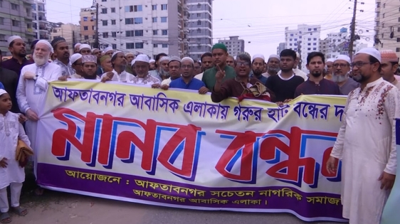 নিজস্ব প্রতিবেদক : আফতাব নগর আবাসিক এলাকায় গরুর হাট বন্ধের দাবিতে সচেতন নাগরিক সমাজ মানববন্ধন করেছে। শুক্রবার জুম্মার নামাজের পর আফতাব নগরে এ কর্মসূচি পালন করা হয়। এসময় বক্তারা বলেন, হাইকোর্টের নিষেধাজ্ঞা সত্ত্বেও ঢাকা উত্তর সিটি কর্পোরেশন এখানে অস্থায়ী পশু হাটের ইজারা বিজ্ঞপ্তি দিয়েছে। পরিবেশ নষ্ট করে পশুহাট বসানোর বিরুদ্ধে প্রতিবাদ জানান তারা।এসময় এই আবাসিক এলাকায় পশুর হাট না বসানোর আহবান জানান বক্তারা।গরুর হাট বসানো বন্ধের দাবি না মানলে প্রধান ফটক বন্ধ করে মানববন্ধন করার হুশিয়ারি দেন তারা।