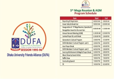 ডুফা সভাপতি অধ্যাপক মাহবুব কায়সার ও সাধারন সম্পাদক দেলোয়ার হোসেনের উদ্যোগে শুক্রবার সকাল ৯ টায় ক্যাম্পাসে বর্ণাঢ্য এক র্যালির মাধ্যমে আয়োজনের আনুষ্ঠানিকতা শুরু হবে। প্রায় আড়াই হাজার ডুফা সদস্য ও তাদের পরিবারের সদস্যরা দিনব্যাপী আকর্ষণীয় এ অনুষ্ঠানে অংশ নেবেন। অনুষ্ঠানে দেশি-বিদেশী নানা খাবার ও আকর্ষণীয় উপহার বিনিময় হবে। রাতে মনোজ্ঞ সাংস্কৃতিক অনুষ্ঠানে স্টেজ মাতাবেন দেশ বরেণ্য শিল্পী ফেরদৌস ওয়াহিদ। থাকবে ডুফার নিজস্ব শিল্পীদের নাচ, গান ও ফ্যাশন শো। নানা পরিবেশনায় অংশ নিতে ডুফার বিভিন্ন উপ কমিটির সদস্যরা নিয়মিত রিহার্সাল করে যাচ্ছেন। বন্ধুদের মধ্যে পারস্পরিক দেখা সাক্ষাত, পুরনো দিনের আড্ডা, স্মৃতিচারণ এ অনুষ্ঠানে ভিন্নমাত্রা যোগ করবে, এমনটাই আশা করছেন আয়োজকরা।