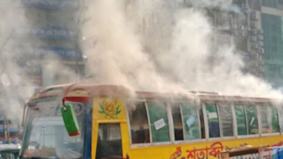 বুধবার (১২ নভেম্বর) দুপুরে এই বাসে আগুন দেওয়া হয়।