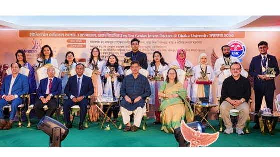ঢাকা বিশ্ববিদ্যালয়ের অধীনে অনুষ্ঠিত এমবিবিএস ফাইনাল প্রফেশনাল পরীক্ষায় চলতিবছর সর্বোচ্চ ফলাফল অর্জনকারী দশজন মেধাবী নবীন চিকিৎসককে স্বীকৃতি জানাতে দেশে প্রথমবারের মতো ‘টপ টেন জিনিয়াস ইন্টার্ন ডক্টর্স, ২০২৫’ আয়োজিত হয়।