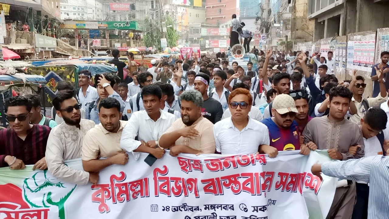 “আমরা কুমিল্লা বিভাগ চাই’ স্লোগানে আবারও মুখর হয়ে উঠেছে প্রাচীন নগরী কুমিল্লা। আজ মঙ্গলবার (১৪ অক্টোবর) দুপুরে কান্দিরপাড় পূবালী চত্বরে হাজারো শিক্ষার্থী, তরুণ ও সাধারণ মানুষ জড়ো হয়ে কুমিল্লা বিভাগ বাস্তবায়নের দাবিতে এক...