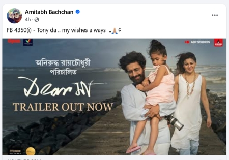 সামাজিক যোগাযোগ মাধ্যমে জয়া আহসান অভিনীত ‘ডিয়ার মা’ ছবির পোস্টার শেয়ার করেছেন অমিতাভ বচ্চন। সেখানে তিনি লিখেছেন-‘টনি দা (পরিচালক অনিরুদ্ধ রায় চৌধুরী)আমার শুভকামনা সব সময়। জয়া আহসান আপ্লুত হয়ে জানিয়েছেন অমিতাভ বচ্চন স্যারের শুভেচ্ছা তার জন্য অনেক বড় পাওয়া।