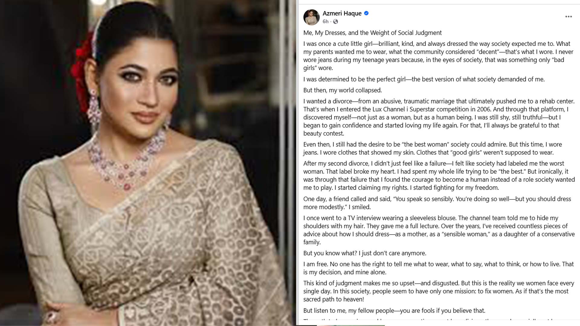 আরও লিখেছেন -‘একদা ভালো নারী হওয়ার চেষ্টা করতাম। বিবাহ বিচ্ছেদের পরে সমাজ সম্ভবত আমাকে সবচেয়ে খারাপ নারীর তকমা দিয়ে দেয়! সারা জীবন কেটেছে ভালো হওয়ার জন্য কিন্তু সমাজের এই উপহাস কিংবা ব্যর্থতার মাঝে আমি খুঁজে পেয়েছি সাহস। মানুষ হয়ে দাঁড়ানোর এক অনমনীয় চরিত্র।