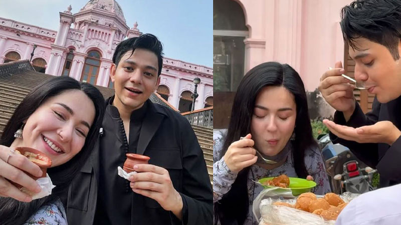 বাংলাদেশে পা দিয়েছেন পাকিস্তানি অভিনেত্রী হানিয়া আমির। তার প্রথম ঝলক দেখ গেল এক ঝালমুড়ির দোকানে। জনপ্রিয় ইউটিউবার রাফসান দ্য ছোট ভাইয়ের সাথে হানিয়া ফুচকা খাচ্ছেন। কিন্তু ঢাকাই ফুচকার ঝাল তিনি সহ্য করতে পারছেন বলে মনে হচ্ছেনা। ঝালে লাল হয়ে গেছে তার মুখ। শেষে ফুচকাওয়ালার কাছে মাফ চেয়ে পানি খেয়ে নিলেন হানিয়া। আহসান মঞ্জিলে রাফসানের সঙ্গে ফুচকা খেতে খেতে গল্প করছেন তিনি।