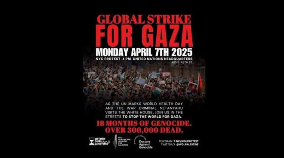 আন্তর্জাতিক ডেস্ক: ফিলিস্তিনের গাজায় ইসরাইলি হামলার প্রতিবাদে সোমবার (৭ এপ্রিল) বিশ্বব্যাপী সাধারণ ধর্মঘটের ঘোষণা দিয়েছে ফিলিস্তিনি ন্যাশনাল এবং ইসলামিক ফোর্সেস গ্রুপ। ফিলিস্তিনি বার্তা সংস্থা ওয়াফা’র বরাত দিয়ে জানিয়েছে আলজাজিরা।