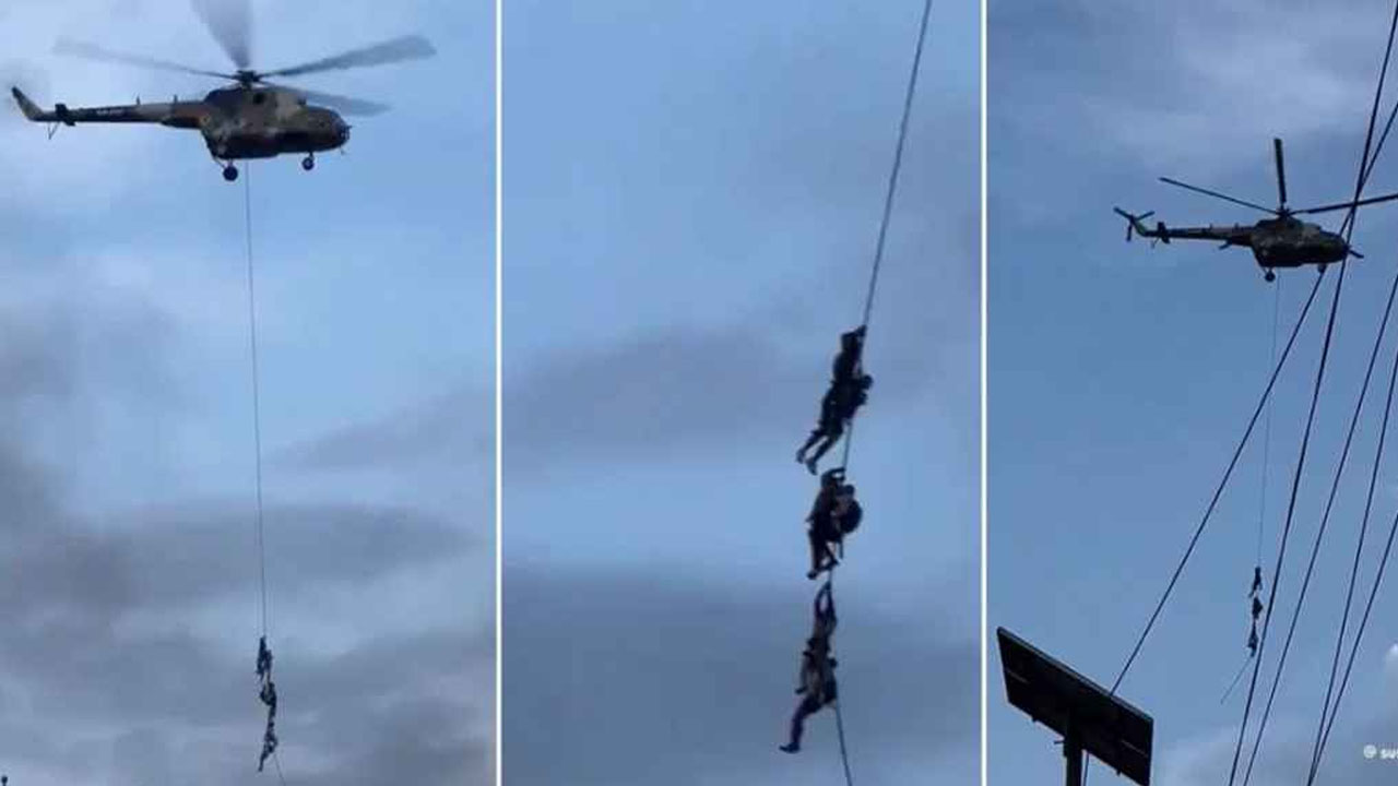 বুধবার (১০ সেপ্টেম্বর) ওই ভিডিওতে দেখা যায়, নেপালের মন্ত্রী এবং তাদের পরিবারের সদস্যদের একটি সেনা হেলিকপ্টার থেকে ফেলা দড়ি (রেসকিউ স্লিং) আঁকড়ে থাকতে দেখা গেছে।