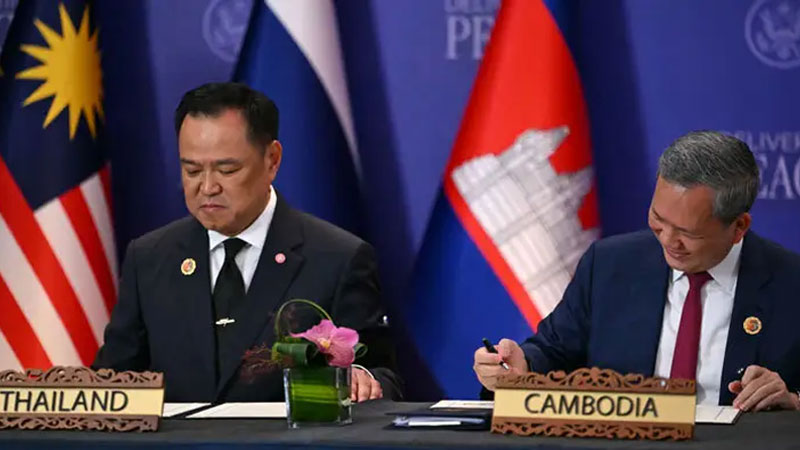সীমান্তে সাম্প্রতিক সংঘাতের প্রেক্ষিতে প্রতিবেশী কম্বোডিয়ার সঙ্গে স্বাক্ষরিত ‘শান্তি চুক্তি’ বাস্তবায়ন স্থগিতের ঘোষণা দিয়েছে থাইল্যান্ড। যুক্তরাষ্ট্রের প্রেসিডেন্ট ডনাল্ড ট্রাম্পের তত্ত্বাবধানে চুক্তি সইয়ের মাত্র দুই সপ্তাহ পরই এই ঘোষণা এল।