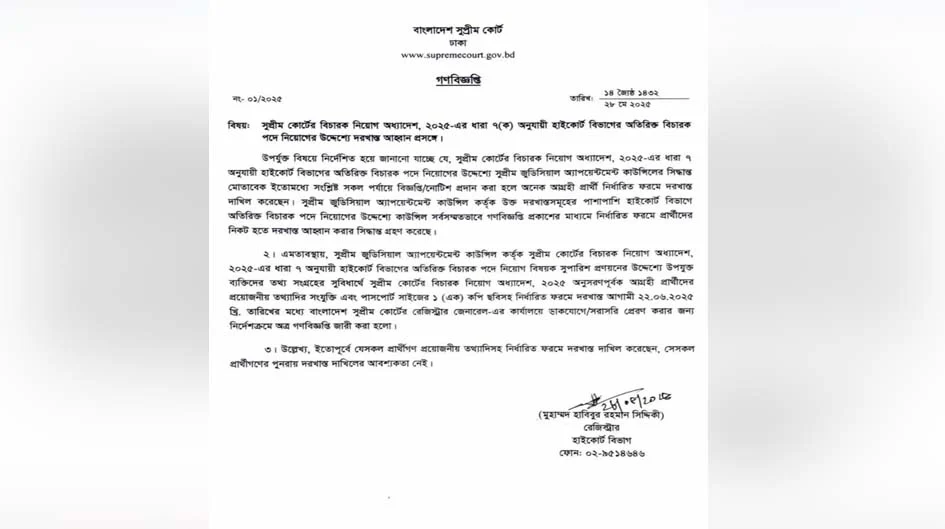 ‘এমতাবস্থায়, সুপ্রিম জুডিসিয়াল অ্যাপয়েন্টমেন্ট কাউন্সিল সুপ্রিম কোর্টের বিচারক নিয়োগ অধ্যাদেশ, ২০২৫-এর ধারা ৭ অনুযায়ী হাইকোর্ট বিভাগের অতিরিক্ত বিচারক পদে নিয়োগ বিষয়ক সুপারিশ প্রণয়নের উদ্দেশ্যে উপযুক্ত ব্যক্তিদের তথ্য সংগ্রহের সুবিধার্থে সুপ্রিম কোর্টের বিচারক নিয়োগ অধ্যাদেশ অনুসরণ করে আগ্রহী প্রার্থীদের প্রয়োজনীয় তথ্যাদির সংযুক্তি এবং পাসপোর্ট সাইজের এক কপি ছবিসহ নির্ধারিত ফরমে দরখাস্ত আগামী ২২ জুনের মধ্যে সুপ্রিম কোর্টের রেজিস্ট্রার জেনারেল কার্যালয়ে ডাকযোগে বা সরাসরি পাঠানোর জন্য গণবিজ্ঞপ্তি জারি করা হলো।’
