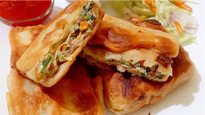 ৪.পরিমান মতো ডিমের মিশ্রন রুটিতে দিয়ে পরোটার ভাঁজের মতো ভাঁজ দিয়ে সাথে সাথে হালকা গরম তেলে ভেজে নিতে হবে।