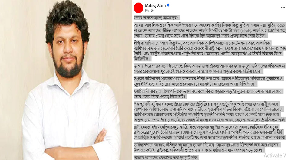 মাহফুজ লেখেন, ‘সংস্কার কমিশনের প্রস্তাবনাগুলো বাস্তবায়ন শিগগির শুরু হবে। আহত ও নিহতদের পরিবারের পুনর্বাসন ও জুলাই গণহত্যার বিচারের কাজও চলমান। এ মাসেই এ কাজগুলো আরও গতি পাবে। ফ্যাসিবাদী ব্যবস্থার বিলোপ নিছক ভাঙা নয়, বরং বিকল্প গড়ারও লড়াই। নতুন বন্দোবস্তে আমরা ভাঙার চেয়ে গড়ার দিকে গুরুত্ব দিতে চাই।’