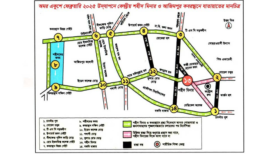বিজ্ঞপ্তিতে আরও বলা হয়, শহীদ মিনার এলাকায় যানজট ও শৃঙ্খলা বজায় রাখতে বৃহস্পতিবার সন্ধ্যা ৬টা থেকে শুক্রবার দুপুর ৩টা পর্যন্ত শাহবাগ ক্রসিং, নীলক্ষেত ক্রসিং, শহীদুল্লাহ হল ক্রসিং, চানখারপুল ক্রসিং, পলাশী ক্রসিং ও বকশীবাজার ক্রসিংয়ে যানচলাচল নিয়ন্ত্রণ (ডাইভারশন) থাকবে।