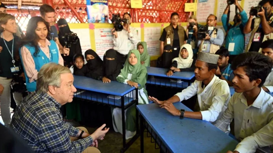 শুক্রবার (১৪ই মার্চ) দুপুরে মহাসচিব গুতেরেস বিমানবন্দর থেকে সরাসরি উখিয়ায় যান। সেখানে তিনি রোহিঙ্গা শিক্ষার্থীদের কথা বলেন এবং রোহিঙ্গা প্রশিক্ষণ সেন্টার, সাংস্কৃতিক কেন্দ্র ও পাটজাত পণ্যের উৎপাদন কেন্দ্র ঘুরে দেখেন। এসময় জাতিসংঘের মহাসচিবকে কাছে পেয়ে রোহিঙ্গা শরণার্থীরা খাদ্য সহায়তা আবারো বৃদ্ধি এবং প্রত্যাবাসনের মাধ্যমে তাদের নিজ দেশে পাঠানোর দাবি জানান।