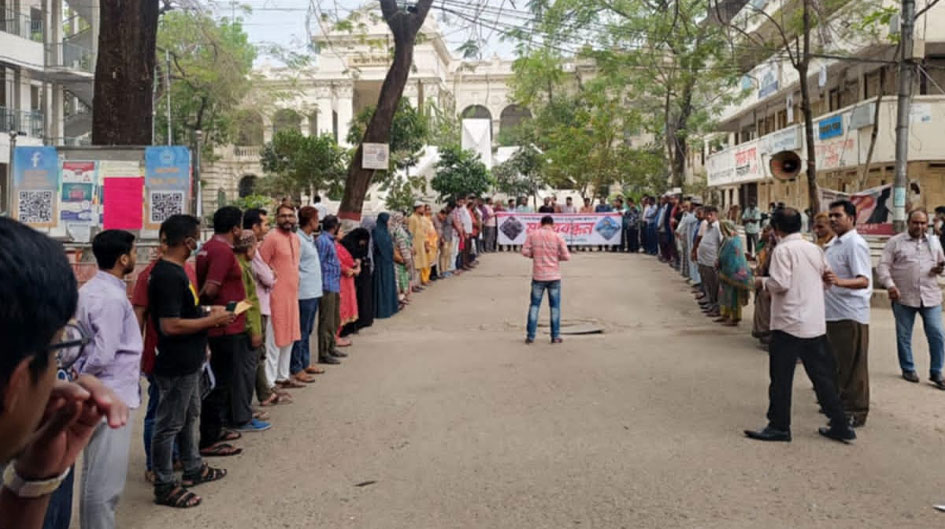 মানববন্ধনে বক্তব্য রাখেন জগন্নাথ বিশ্ববিদ্যালয় শিক্ষক সমিতির সভাপতি ড. মোশাররফ হোসেন, সাধারণ সম্পাদক ড. মোঃ রইস উদ্দীন ও সহ সভাপতি অধ্যাপক ড. মোঃ আজম খান প্রমুখ।