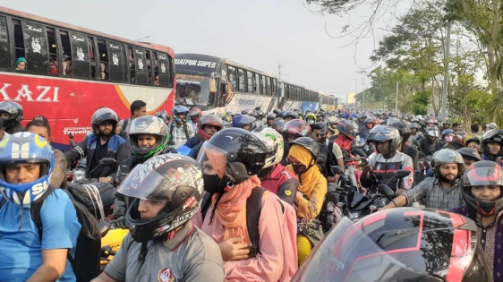 সরেজমিনে পদ্মা সেতুর টোল প্লাজার কাছে গাড়ির জটলা দেখা যায়। মোটরসাইকেলের দীর্ঘ লাইন দেখা যায়। এক্সপ্রেসওয়ের দুটি লেনে মোটরসাইকেলের এই দীর্ঘ লাইন। হিমশিম খাচ্ছে টোল প্লাজার কর্মীরা। বাসের টিকিট না পেয়ে অনেকে বাধ্য হয়ে, আবার অনেকে ইচ্ছে করেই উৎসবমুখর পরিবেশে মোটরসাইকেলে করে বাড়ি ফিরছেন।