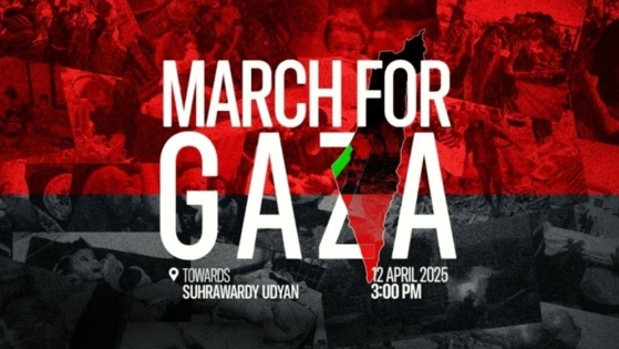 এর মাধ্যমে ফিলিস্তিনের গাজা উপত্যকায় অবৈধ দখলদার ইসরাইলের চলমান গণহত্যা ও জাতিগত নিধনের বিরুদ্ধে সম্মিলিত প্রতিবাদ করবে বাংলাদেশ। প্যালেস্টাইন সলিডারিটি মুভমেন্ট বাংলাদেশের উদ্যোগে আজ শনিবার বিকেল ৩টায় ঐতিহাসিক সোহরাওয়ার্দী উদ্যান অভিমুখে ‘মার্চ ফর গাজা’ অনুষ্ঠিত হবে। এতে সভাপতিত্ব করবেন জাতীয় মসজিদ বায়তুল মোকাররমের খতিব মাওলানা আব্দুল মালেক।