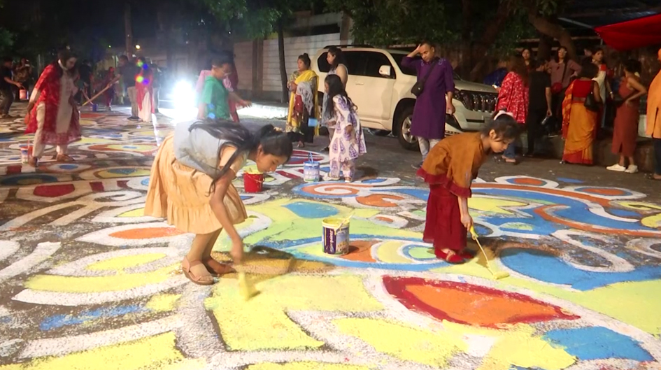 ঘডির কাটায় রাত তখন একটা। রং তুলি নিয়ে ব্যস্ত শিশুরা। বড়দের অনেকেও ব্যস্ত আলপনা আঁকতে। এ যেন যেমন খুশি তেমন আঁকার মতোই।