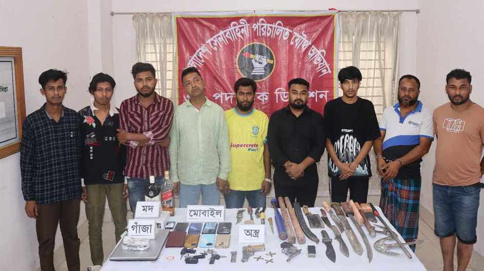 অভিযানে টেবিলের নিচে লুকিয়ে রাখা অবস্থায় একটি ৯ এমএম পিস্তল, চার রাউন্ড গুলি, একটি রিভলভার, আট রাউন্ড রিভলভার অ্যামুনিশন, ইয়াবা, বিদেশি মদ, স্বর্ণের চেন, ল্যাপটপসহ নানা অবৈধ সামগ্রী উদ্ধার করা হয়।