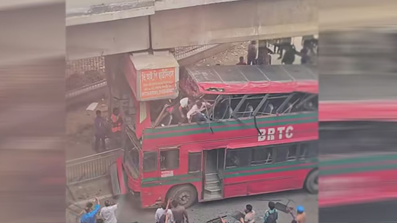 রাজধানী ঢাকার ফার্মগেট এলাকায় বাংলাদেশ সড়ক পরিবহন কর্তৃপক্ষের (বিআরটিসি) দোতলা একটি বাস এলিভেটেড এক্সপ্রেসওয়ের র্যাম্পের নিচে ঢুকে গেছে। সেখানে একটি পিলারের সঙ্গে ধাক্কা খায় বাসটি।