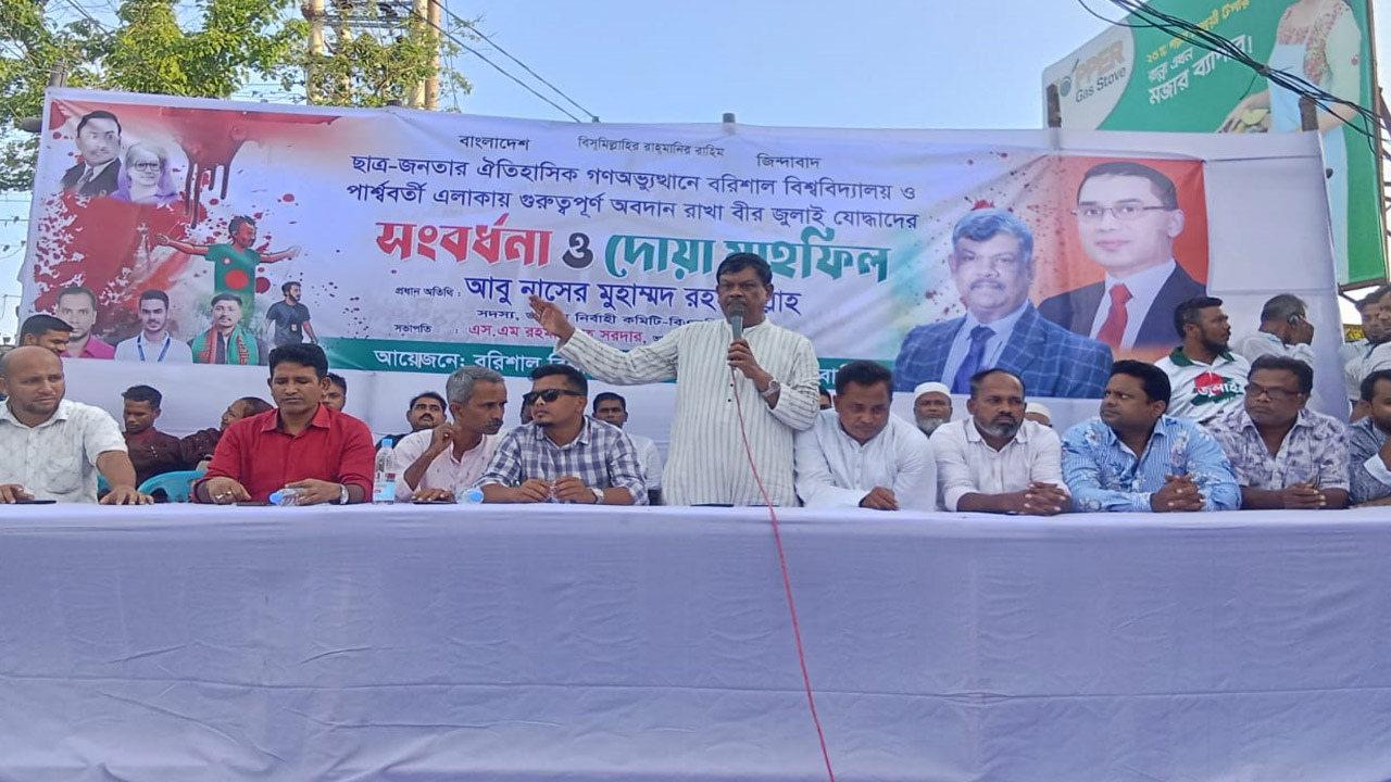 শনিবার (৯আগস্ট) বিকেল বরিশাল বিশ্ববিদ্যালয়ের সম্মুখে বিশ্ববিদ্যালয় ও পার্শ্ববর্তী এলাকাবাসীর আয়োজনে ছাত্র-জনতার ঐতিহাসিক গণঅভ্যুথানে বরিশাল বিশ্ববিদ্যালয় ও পার্শ্ববর্তী এলাকায় গুরুত্বপূর্ণ অবদান রাখা বীর জুলাই যোদ্ধাদের সংবর্ধনা ও দোয়া মাহফিলে প্রধান অতিথি হিসেবে এ কথা বলেন তিনি।