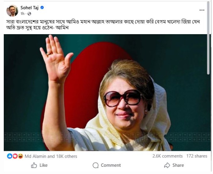 সোহেল তাজ লেখেন, সারা বাংলাদেশের মানুষের সঙ্গে আমিও মহান আল্লাহ তাআলার কাছে দোয়া করি বেগম খালেদা জিয়া যেন অতি দ্রুত সুস্থ হয়ে ওঠেন- আমিন।