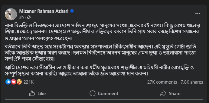 খালেদা জিয়ার সুস্থতা কামনা করে আজহারী আরও লিখেছেন, দেশের জন্য বহু ত্যাগ স্বীকার করা, ধর্মীয় মূল্যবোধে অনুগত এই মহীয়সী নারীর দ্রুত আরোগ্যের জন্য তিনি আন্তরিকভাবে দোয়া করছেন। তার ভাষায় “আল্লাহ তাআলা তাঁকে দ্রুত পূর্ণ সুস্থতা দান করুন।”