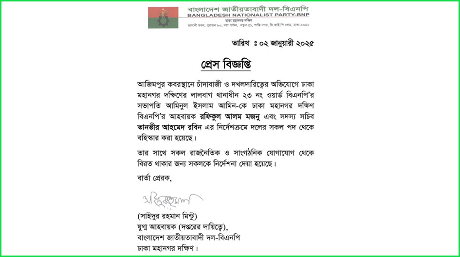 ঢাকা মহানগর দক্ষিণ বিএনপির আহ্বায়ক রফিকুল আলম মজনু এবং সদস্য সচিব তানভীর আহমেদ রবিনের নির্দেশক্রমে দলের সকল পদ থেকে বহিষ্কার করা হয়েছে বলে বিজ্ঞপ্তিতে উল্লেখ করা হয়েছে।