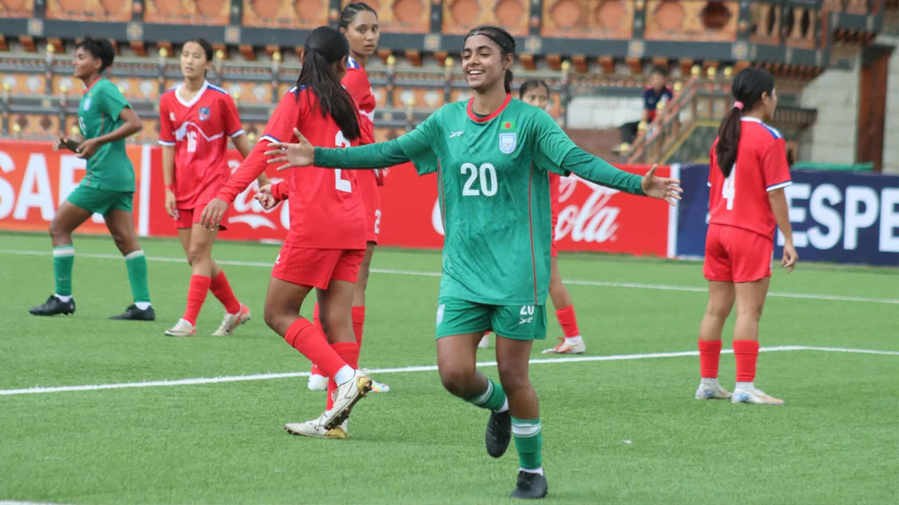 বাংলাদেশকে আজ গোলের জন্য ৩৮ মিনিট পর্যন্ত অপেক্ষা করতে হয়েছে। ৩৮ মিনিটে থৈনু একক প্রচেষ্টায় নেপালের বক্সে প্রবেশ করে কোনাকুনি শটে গোল করেন। মিনিট সাতেক পর ব্যবধান দ্বিগুণ করেন প্রীতি। ইনজুরি সময়ে কর্ণার থেকে বাংলাদেশি ডিফেন্ডারদের অসতর্কতায় নেপাল এক গোল পরিশোধ করে।