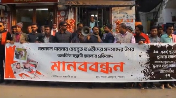 সংবাদ সম্মেলন শেষে পাবনা প্রেসক্লাবের সামনে হিজবুত তাওহীদের ওপর হামলার প্রতিবাদ ও বিচারের দাবিতে মানববন্ধন করে নেতাকর্মীরা। এ সময় বিচারের দাবিতে বিভিন্ন স্লোগান দেয় তারা।