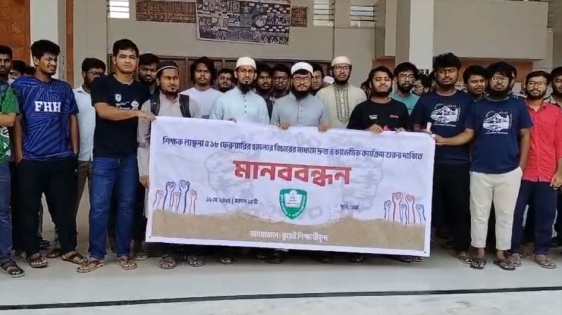 সোমবার (১২ মে) কুয়েট স্টুডেন্ট ওয়েলফেয়ার সেন্টারের সামনে এই মানববন্ধন করে তারা।