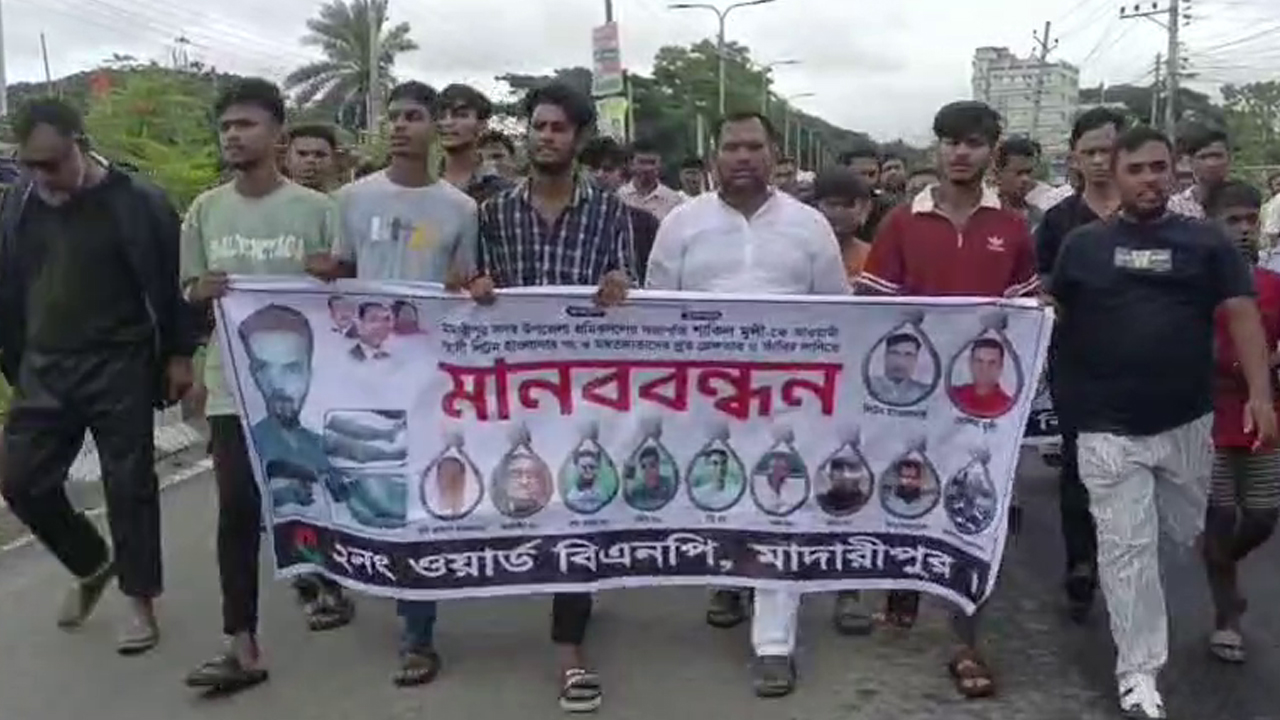 মাদারীপুর সদর উপজেলা শ্রমিকদলের সভাপতি শাকিল মুন্সিকে হত্যার বিচার দাবিতে বিক্ষোভ ও মানববন্ধন করেছে বিএনপি ও এর অঙ্গসংগঠনের নেতা-কর্মীরা। মঙ্গলবার সকালে পুরান বাজার থেকে একটি বিক্ষোভ মিছিল বের হয়ে জেলা প্রশাসকের কার্যালয়ে গিয়ে শেষ হয়। স্থানীয়রা জানান, সম্প্রতি মাদারীপুরে পৌর শ্রমিকদলের কমিটি গঠন করা হয়। এই কমিটির বিরোধিতা করেন সদর উপজেলা শ্রমিকদলের একাংশের সভাপতি শাকিল মুন্সি। এর জের ধরে গত ২৩ মার্চ রাতে শাকিলকে কুপিয়ে হত্যা করা হয়। নিহত শাকিল মুন্সি মাদারীপুর সদর উপজেলার নতুন মাদারীপুর এলাকা মোফাজ্জল মুন্সির ছেলে। এঘটনায় মাদারীপুর সদর থানায় একটি হত্যা মামলা দায়ের করা হয়। এতে কিছু আসামি গ্রেফতার হলেও অনেকেই উচ্চ আদালত থেকে জামিন নিয়ে শাকিলের স্বজন ও মামলার বাদীকে ভয়-ভীতি দেখাচ্ছে। এর প্রতিবাদ ও আসামিদের জামিন না দেয়ার দাবিতেই এই সমাবেশের আয়োজন করা হয়। এসময় বক্তব্য রাখেন বিএনপির নির্বাহী কমিটির সদস্য কাজী হুমায়ন কবির, জেলা বিএনপির যুগ্ম আহবায়ক সোহরাব হোসেন হাওলাদার, এ্যাডভোকেড জামিনুর রহমান মিঠু, জেলা শ্রমিকদলের সদস্য সচিব এ্যাডভোকেড অহিদুজ্জামান খান, মামলার বাদী ও নিহতের ভাই হাসান মুন্সিসহ অনেকে।