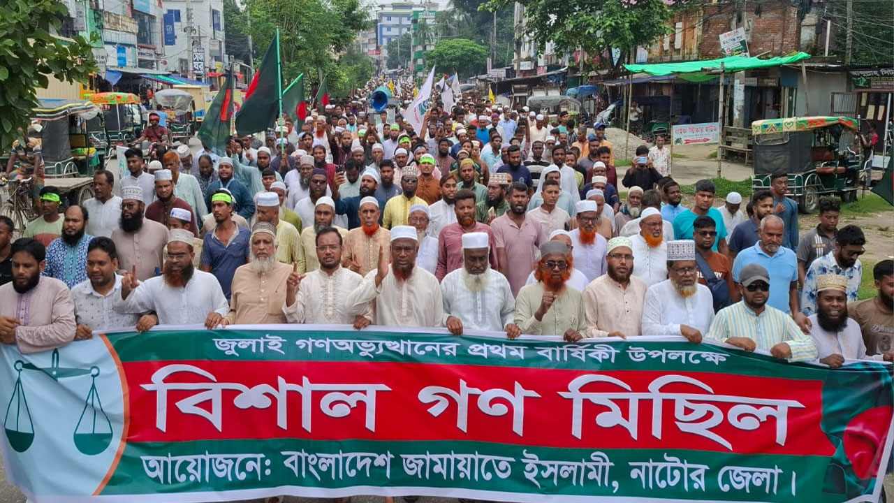 জুলাই গণঅভ্যুত্থানের প্রথম বর্ষপূর্তিতে নাটোরে বিশাল গণ মিছিল ও সমাবেশ করেছে বাংলাদেশ জামায়াতে ইসলামী। মিছিলটি শহরের মাদ্রাসা মোড় থেকে শুরু হয়ে প্রধান সড়কে শহর প্রদক্ষিণ করে একই স্থানে এসে শেষ হয়।