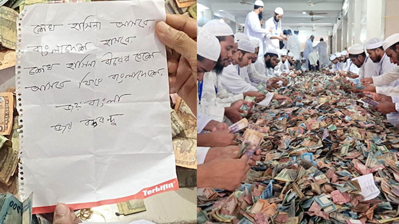 শেখ হাসিনা আসবে বাংলাদেশ হাসবে, শেখ হাসিনা বীরের বেশে আসবে ফিরে বাংলাদেশে, জয় বাংলা জয় বঙ্গবন্দু। কিশোরগঞ্জের পাগলা মসজিদের দানবাক্সে পাওয়া গেল একটি চিঠি। যে চিঠিতে লেখা রয়েছে-‘শেখ হাসিনা আসবে বাংলাদেশ হাসবে।’