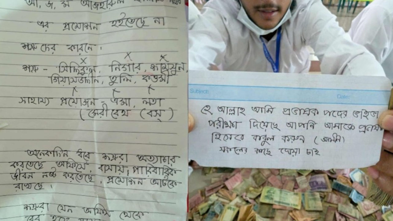 শনিবার (৩০ আগস্ট) সকালে মসজিদের দানবাক্স খোলার পর এমন অভিনব লেখা চিরকুট পাওয়া যায়।