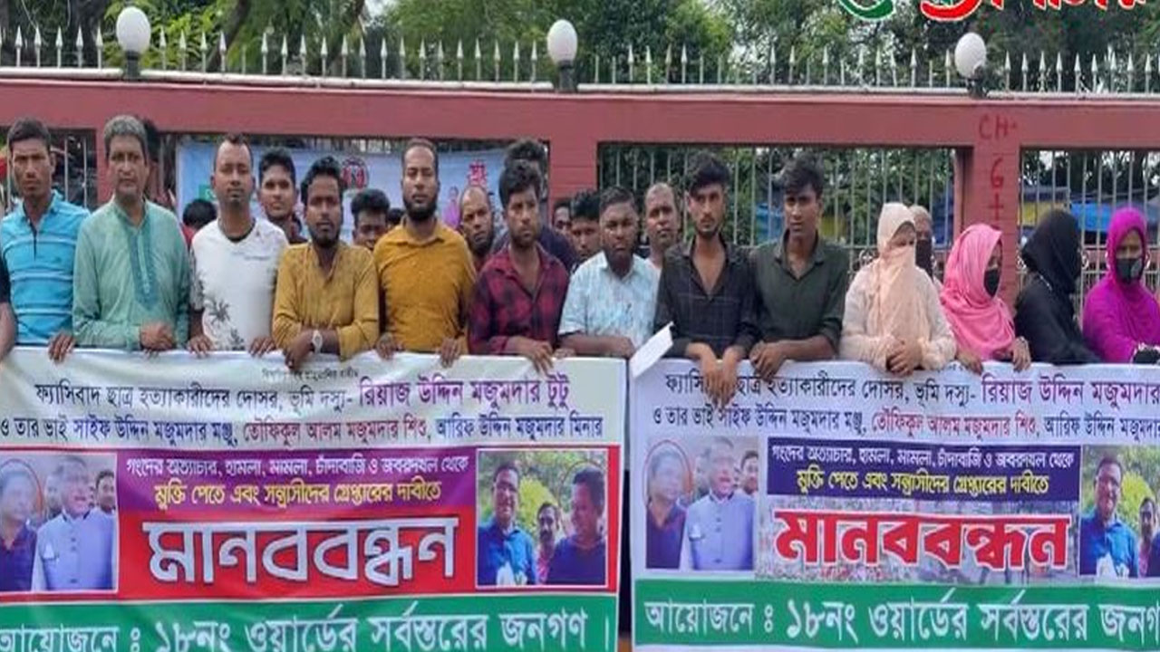 মানববন্ধনে বক্তারা অভিযোগ করেন, দীর্ঘদিন ধরে স্থানীয় আওয়ামী লীগপন্থী চার ব্যক্তি—রিয়াজ উদ্দিন মজুমদার টুটু, তার ভাই সাইফ উদ্দিন মজুমদার মঞ্জু, তৌফিকুল আলম মজুমদার শিশু ও আরিফ উদ্দিন মজুমদার মিনার—ওই এলাকায় সন্ত্রাসের রাজত্ব কায়েম করেছেন। তারা নিয়মিত চাঁদা দাবি করেন, জমি দখলের চেষ্টা চালান এবং বিরোধীদের বিরুদ্ধে মিথ্যা মামলা দিয়ে হয়রানি করেন।