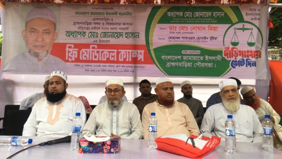 ব্রাহ্মণবাড়িয়া পৌরসভার জামায়াতে ইসলামীর আমির মোঃ শাখাওয়াত হোসেন মাস্টারের সভাপতিত্বে ও পৌর শাখার সেক্রেটারি হাফেজ কাউছার আহমেদের সঞ্চালনায় অনুষ্ঠিত ফ্রি-মেডিকেল ক্যাম্পের উদ্বোধনী অনুষ্ঠানে প্রধান অতিথি হিসেবে বক্তব্য দেন বাংলাদেশ জামায়াতে ইসলামীর ব্রাহ্মণবাড়িয়া জেলা জামায়াতের সহকারী সেক্রেটারি ও ব্রাহ্মণবাড়িয়া-৩ (সদর-বিজয়নগর) আসন থেকে জামায়াত মনোনীত এমপি প্রার্থী মোঃ জুনায়েদ হাসান।