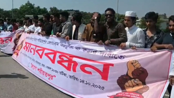 শরীয়তপুরকে ঢাকা বিভাগে রাখার দাবিতে পদ্মা সেতুর জাজিরা প্রান্ত এলাকায় মানববন্ধন ও বিক্ষোভ করেছে ছাত্র জনতা। আজ মঙ্গলবার সকাল ১১ টায় জাগো শরীয়তপুরের ব্যানারে এই বিক্ষোভ কর্মসূচি পালন করেন তারা।