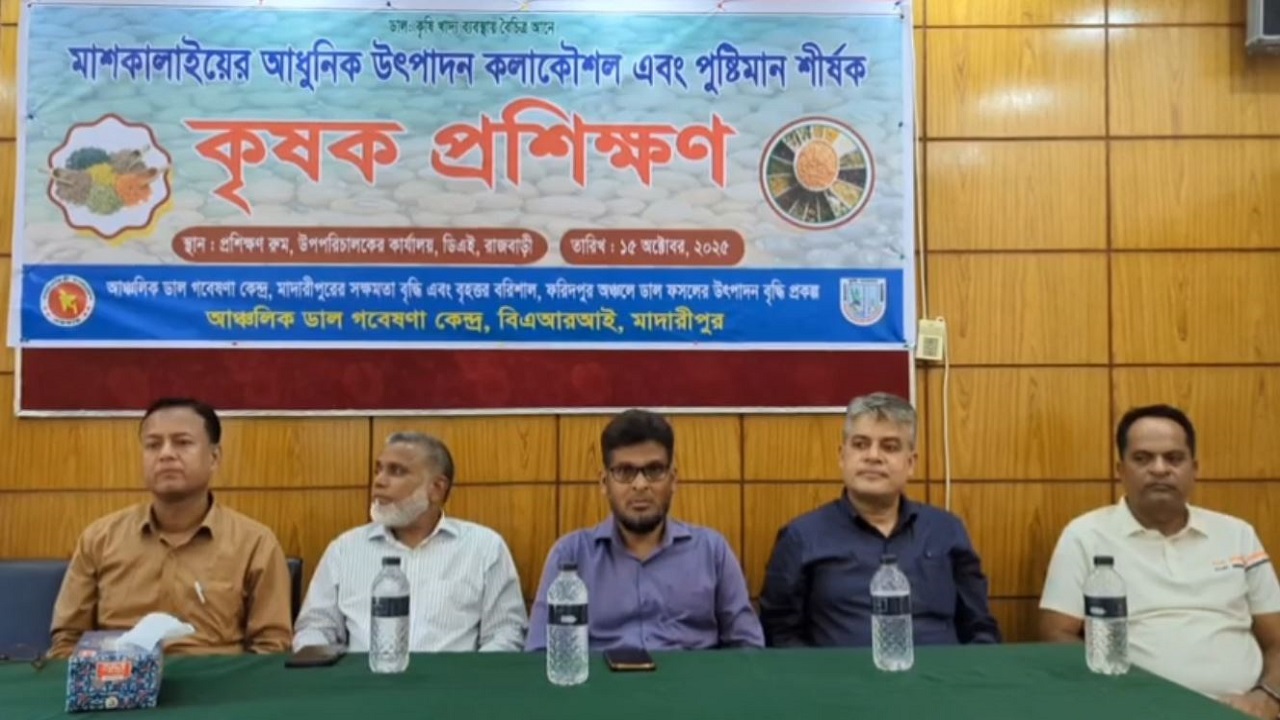 রাজবাড়ীতে মাশকালাই চাষে আধুনিক উৎপাদন কলাকৌশল ও পুষ্টিমান বিষয়ক দিনব্যাপী কৃষক প্রশিক্ষণ অনুষ্ঠিত হয়েছে। প্রশিক্ষণ শেষে কৃষকদের মাঝে কৃষি উপকরণ বিতরণ করা হয়। আজ বুধবার (১৫ অক্টোবর) সকালে রাজবাড়ী কৃষি সম্প্রসারণ অধিদপ্তরের উপপরিচালকের কার্যালয়ের প্রশিক্ষণ কক্ষে মাদারীপুর আঞ্চলিক ডাল গবেষণা কেন্দ্রের উদ্যোগে এ প্রশিক্ষণের আয়োজন করা হয়।