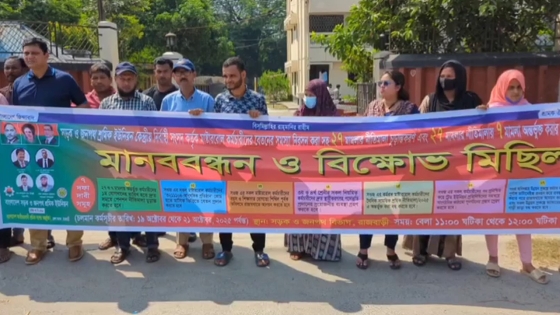 রাজবাড়ীতে বেতন বৈষম্য নিরসন, চাকরির স্থায়ীকরণসহ সাত দফা দাবিতে মানববন্ধন ও বিক্ষোভ মিছিল করেছেন সড়ক ও জনপথ (সওজ) বিভাগের মাস্টাররোলভুক্ত কর্মচারীরা। আজ রোববার (১৯ অক্টোবর) দুপুরে রাজবাড়ী সড়ক ও জনপথ কার্যালয়ের সামনে ঘণ্টাব্যাপী এ মানববন্ধন অনুষ্ঠিত হয়।