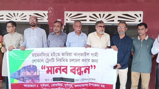 ময়মনসিংহ থেকে নেত্রকোনার জারিয়া ঝাঞ্জাইল রুটে লোকাল ট্রেন বন্ধের প্রতিবাদে এবং অবিলম্বে উক্ত রুটে ট্রেন চালুর দাবি জানিয়েছে সাধারণ মানুষ। এ উপলক্ষে ময়মনসিংহ রেল স্টেশনে মানববন্ধন করেছে সাধারণ মানুষ। গতকাল সোমবার (২০ অক্টোবর) দুপুরে এই মানববন্ধনে বিপুলসংখ্যাক মানুষের পাশাপাশি সাধারণ যাত্রীরাও অংশ নেন।