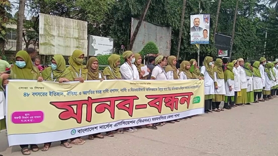 ৪৮ বছরের ইতিহাস ঐতিহ্য ও অগ্রগতির স্বতন্ত্র নার্সিং প্রশাসন, নার্সিং ও মিডওয়াইফারী অধিদপ্তরকে বিলুপ্ত করে ভিন্ন অধিদপ্তরে একিভূত করনের অপচেষ্টার প্রতিবাদে ময়মনসিংহে মানববন্ধন অনুষ্ঠিত হয়েছে। গতকাল বৃহস্পতিবার বিকালে ময়মনসিংহ মেডিকেল কলেজ হাসপাতালের সামনে এ মানববন্ধন অনুষ্ঠিত হয়।