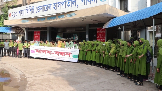 বাংলাদেশ নার্সেস এসোসিয়েশন (বিএনএ) পাবনা জেলা সভাপতি মো. রফিকুল ইসলামের সভাপতিত্বে অনুষ্ঠিত মানবন্ধনে বক্তব্য রাখেন পাবনা সরকারি নার্সিং কলেজের অধ্যক্ষ মোছা. জীবন নেছা বেগম, সাধারন সম্পাদক মো. আব্দুস সামাদ, সহ-সভাপতি সাফায়েত হোসেন, নার্সিং প্রতিনিধি মোছা ইতি খাতুন, শিক্ষার্থী প্রতিনিধি সিরাজুল ইসলাম ও সংগঠনের সদস্য মো. নজরুল ইসলাম।