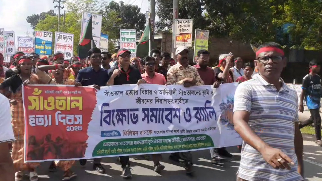 সাঁওতাল হত্যা দিবস উপলক্ষে সাঁওতাল হত্যার বিচার ও আদিবাসী সাঁওতালদের ভূমি এবং জীবনের নিরাপত্তার দাবি জানিয়েছেন স্থানীয়রা। এ উপলক্ষে গাইবান্ধায় বিক্ষোভ সমাবেশ এবং র্যালি অনুষ্ঠিত হয়েছে। আজ বৃহস্পতিবার দুপুরে জেলার গোবিন্দগঞ্জের সাহেবগঞ্জ বাগদা ফার্ম ভূমি উদ্ধার কমিটির আয়োজনে জেলা শহরের এলজিইডি ভবনের সামন থেকে র্যালিটি বের হয়ে শহরের প্রধান প্রধান সড়ক প্রদক্ষিণ করে পৌর পার্কে গিয়ে শেষ হয়। সেখানে তীর ধনুক হাতে প্রতিবাদী বিক্ষোভ সমাবেশ করে আদিবাসী সাঁওতালরা।