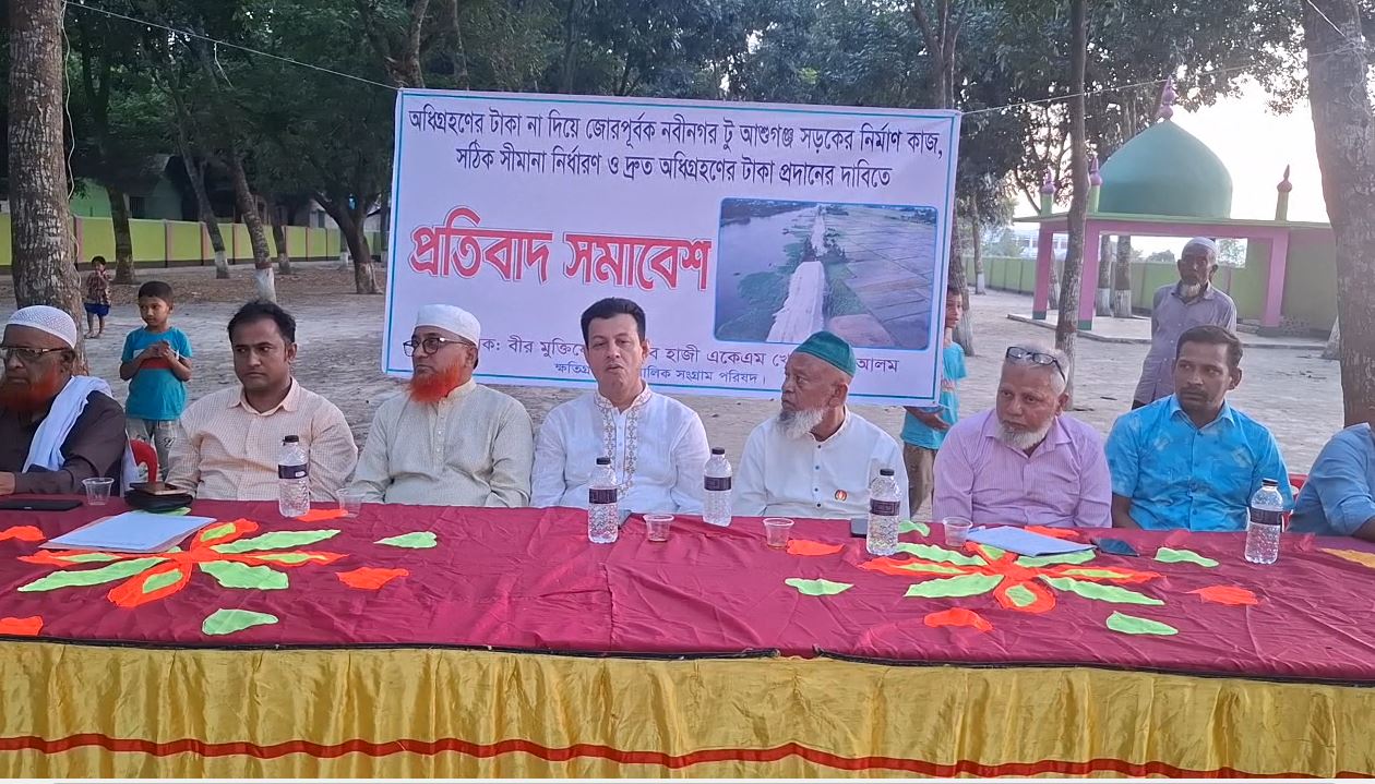 ব্রাহ্মণবাড়িয়ার আশুগঞ্জ-নবীনগর সড়ক প্রকল্পের সীমানা নির্ধারণ করে দ্রুত ভূমি অধিগ্রহণের টাকা প্রদান, সড়কের কাজ দ্রুত সম্পন্ন করা ও ভূমি অধিগ্রহণের টাকা না দিয়ে জোরপূর্বক রাস্তা নির্মাণের প্রতিবাদে ক্ষতিগ্রস্ত ভূমি মালিকদের বিক্ষোভ সমাবেশ অনুষ্ঠিত হয়েছে। শনিবার (১৫ নভেম্বর) বিকালে আশুগঞ্জ ক্ষতিগ্রস্ত ভূমি মালিক সংগ্রাম পরিষদের উদ্যোগে উপজেলার আড়াইসিধা কেন্দ্রীয় ঈদগাহ মাঠে এই প্রতিবাদ সমাবেশ অনুষ্ঠিত হয়।