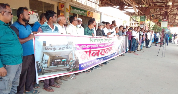 দিনাজপুরের বিরামপুর রেলস্টেশনে কুড়িগ্রাম ও পঞ্চগড় আন্ত:নগর ট্রেনের যাত্রা বিরতি, অন্যান্য ট্রেনের আসন সংখ্যা বৃদ্ধি, জিআরপি পুলিশ ফাঁড়ি স্থাপন এবং স্টেশন সংলগ্ন রেল গেট সম্প্রসারণের দাবি জানিয়েছেন স্থানীয়রা। ওই দাবি জানিয়ে বুধবার ১৯নভেম্বর বিরামপুর রেল স্টেশনে পেশাজীবি ঐক্য ফ্রন্ট মানববন্ধন ও সমাবেশ করেছে। এদিন সকাল সাড়ে ১০টায় ঢাকাগামী ডাউন কুড়িগ্রাম এক্সপ্রেস বিরামপুর রেলস্টেশনে ৫মিনিট দাঁড়িয়ে দাবির প্রতি সমর্থন জানিয়েছে। এসময় লোকো মাষ্টারকে মিষ্টিমুখ করা হয় এবং স্মারকলিপি প্রদান করা হয়।