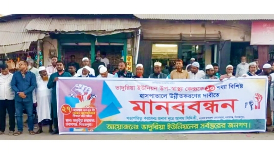 বৃহস্পতিবার (২৭ নভেম্বর) বিকেলে এ মানববন্ধন করেছে এলাকাবাসী। ভাদুরিয়া চারমাথা মোড়ে এই মানববন্ধন অনুষ্ঠিত হয়।