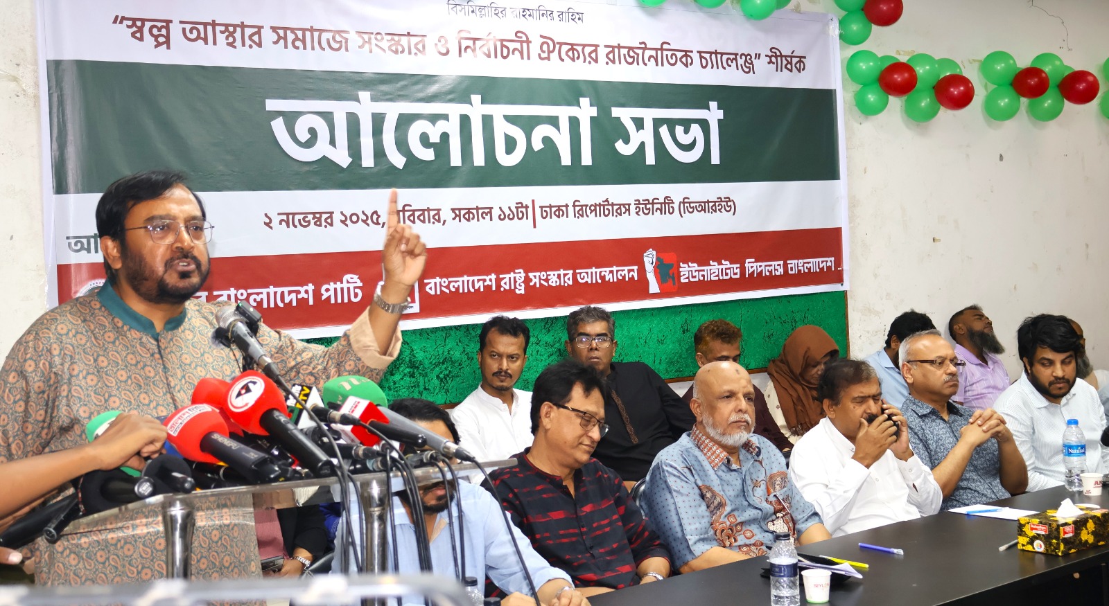 দেশের তিনটি দলের যৌথ উদ্যোগে 'স্বল্প আস্থার সমাজে সংস্কার ও নির্বাচনী ঐক্যের রাজনৈতিক চ্যালেঞ্জ’ শীর্ষক এক আলোচনা সভা আজ রোববার সকালে ঢাকা রিপোর্টার্স ইউনিটি মিলনায়তনে অনুষ্ঠিত হয়। এতে অংশ নেন বাংলাদেশ রাষ্ট্র সংস্কার আন্দোলন, এবি পার্টি এবং আপ বাংলাদেশ দলের বিভিন্ন পর্যায়ের নেতারা। সভায় কয়েকটি রাজনৈতিক দলের মন যুগিয়ে চলার নীতি বাদ দেওয়ার জন্য সরকারের প্রতি আহ্বান জানানো হয়। সভায় তিন দলের ঐক্যবদ্ধ পথ চলার অঙ্গীকার ব্যক্ত করা হয়।